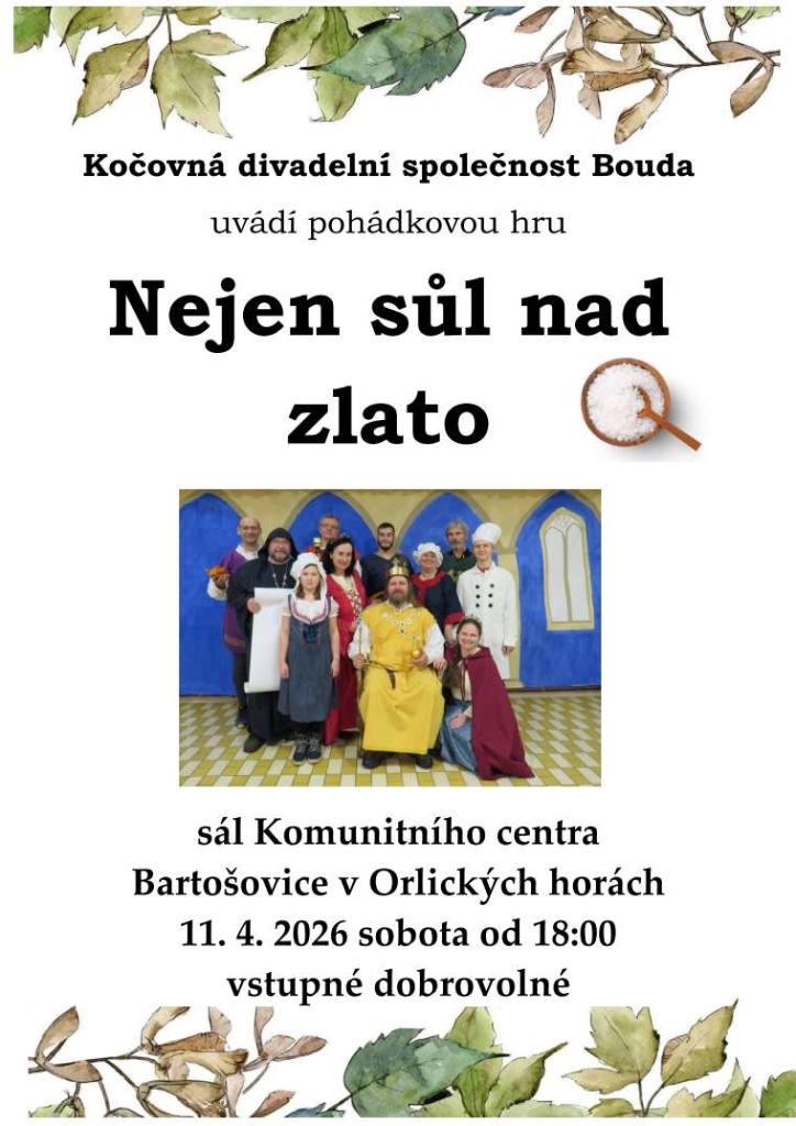 Kočovná divadelní společnost Bouda uvádí pohádkovou hru Nejen sůl nad zlato. Představení se koná v sobotu 11. dubna 2026 od 18:00 v sále Komunitního centra v Bartošovicích v Orlických horách. Vstupné je dobrovolné.